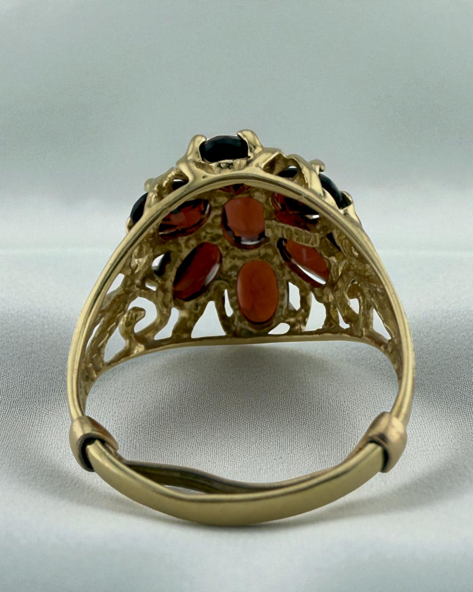 This bold 14K gold ring commands attention with seven vibrant garnets set within an intricate floral filigree design.